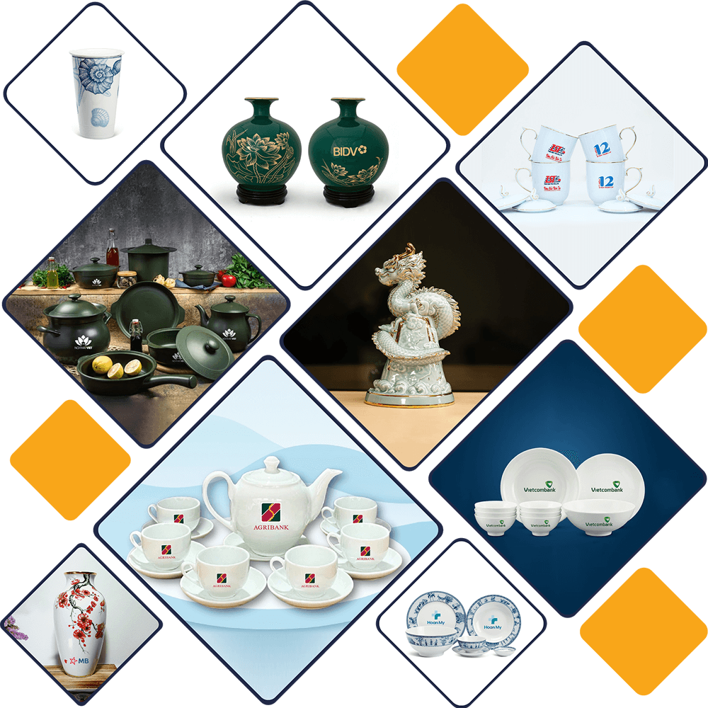 Đa dạng sản phẩm như bộ ấm trà, bình hoa, ly chén sứ, bộ bát đĩa, đũa muỗng,… đều có thiết kế tinh tế và giàu tính nghệ thuật.