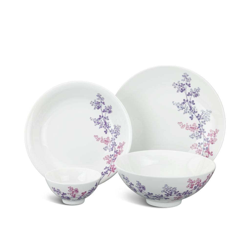 Những nhành cỏ tím uốn lượn mềm mại trên nền men sứ sáng bóng tạo nên sự thanh thoát nhưng không kém phần sang trong trong từng bình trà, tách, tô, chén chấm… Màu tím còn tượng trưng cho sự thủy chung, gợi nhắc người thương luôn quý trọng hạnh phúc gia đình.