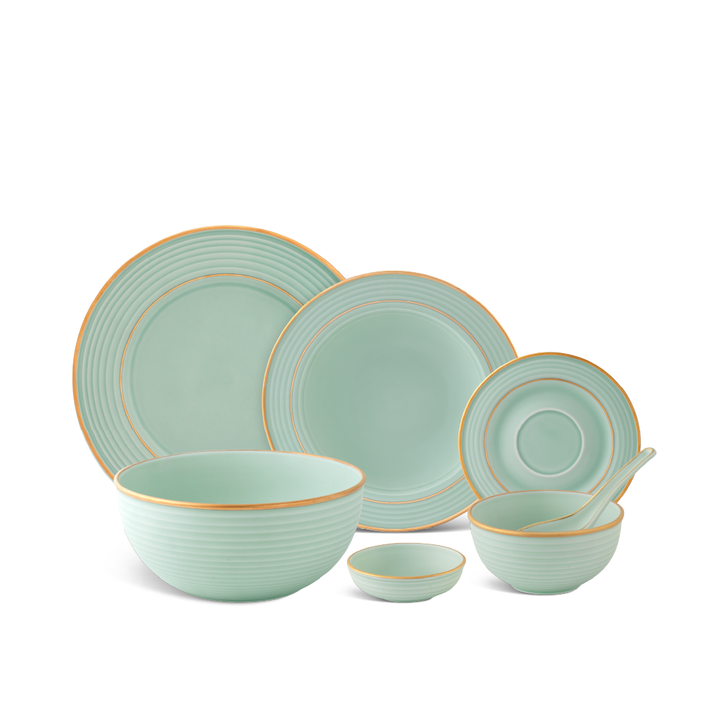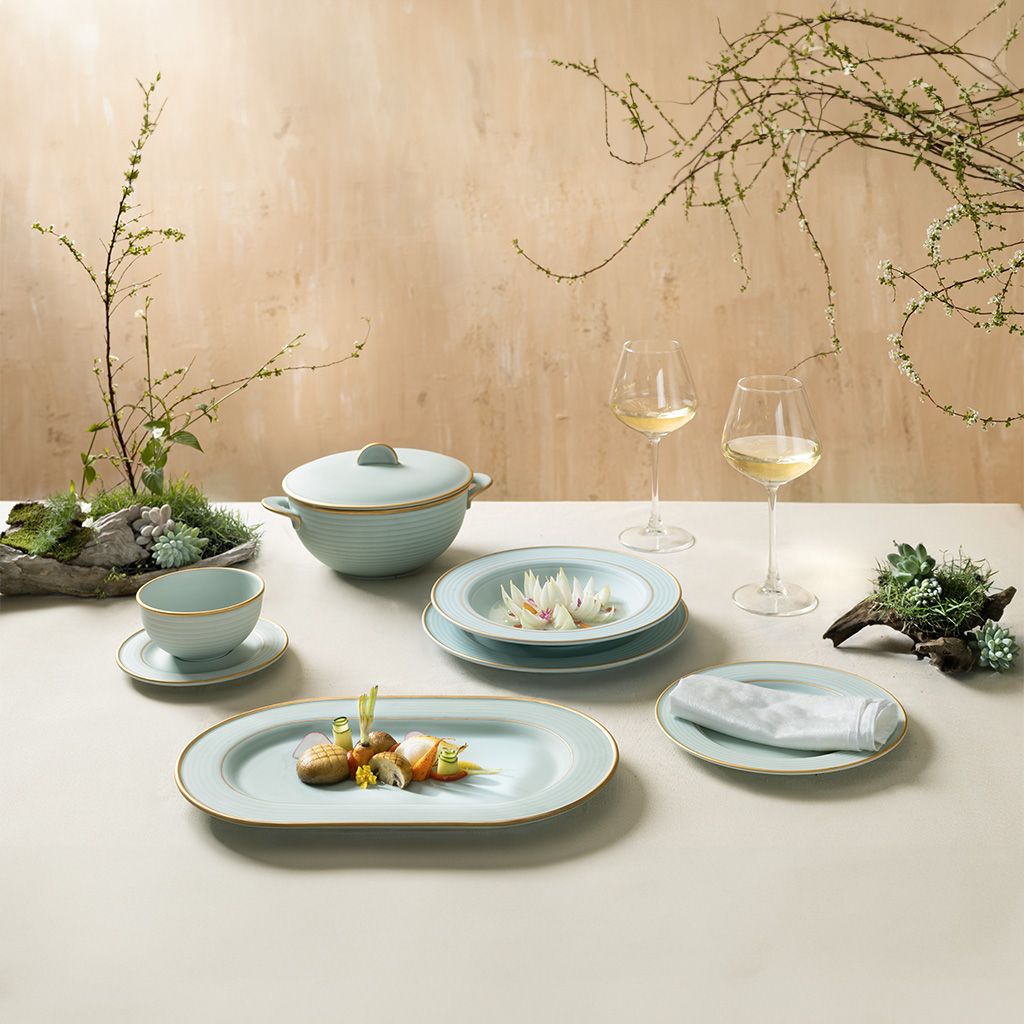 Cordon men ngọc sương mờ thể hiện vẻ đẹp mỹ thuật tinh tế, tạo phong cách đồng nhất và sang trọng cho không gian bàn ăn. Sản phẩm nổi bật với màu men Celadon khó chinh phục nhất trong lịch sử gốm sứ. Nay các nghệ nhân Minh Long ứng dụng thêm kỹ thuật chế tác phủ lớp sương mờ, tạo cảm giác mềm mượt như nhung. Sự hài hòa trong kiểu dáng và màu sắc, cùng những nét vẽ vàng 24k sắc sảo giúp tôn lên hương vị và nâng tầm trải nghiệm của thực khách.