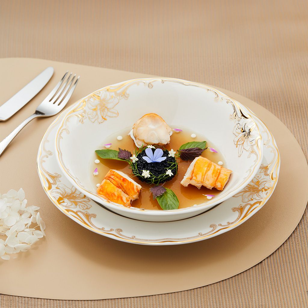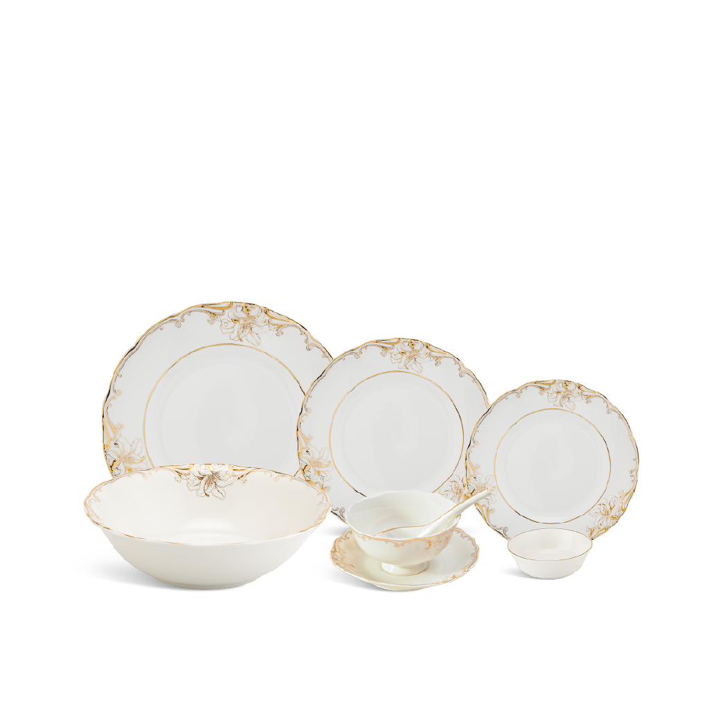 Bộ sản phẩm Đài Các toát lên vẻ đẹp kiêu sa, lộng lẫy theo phong cách quyền quý hoàng gia. Bộ sản phẩm có kiểu dáng sang trọng, nhiều đường nét được cách điệu, uốn lượn với dáng điệu mềm mại, mảnh mai. Cái tài của các nghệ nhân là đã khéo léo viền vàng ở những điểm nổi bật như vành chén, vành đĩa, tay cầm và nắp bình trà… tôn lên vẻ đẹp đẳng cấp của không gian ẩm thực cũng như phong cách thẩm mỹ của chủ sở hữu.