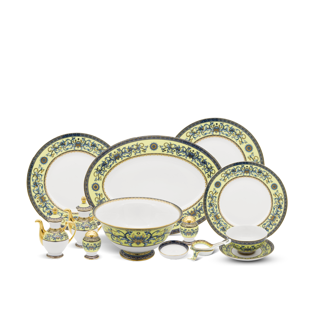 Hoàng Cung là dãy sản phẩm cao cấp của Minh Long, mang phong cách cung đình, vương tộc nhưng vẫn đậm đà hình ảnh văn hóa dân gian Việt Nam. Sự sáng tạo nghệ thuật thể hiện ở từng nét vẽ có tính thẩm mỹ riêng tạo nên phần hồn, chiều sâu văn hóa của từng sản phẩm. Hoàng Cung Hoàng Liên có hình ảnh chủ đạo từ hoa sen cách điệu phối với các đường nét hoàng cung trên nền men vàng quý tộc. Sản phẩm được mạ vàng 24k bao quanh đường viền, vành nắp tạo nên bộ bàn ăn cực kỳ sang trọng, tinh tế mà thấm đượm hồn Việt.
