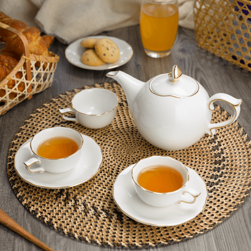 - Viền chỉ vàng tinh xảo: Được dát thủ công, tạo điểm nhấn sang trọng và đẳng cấp cho bộ trà.