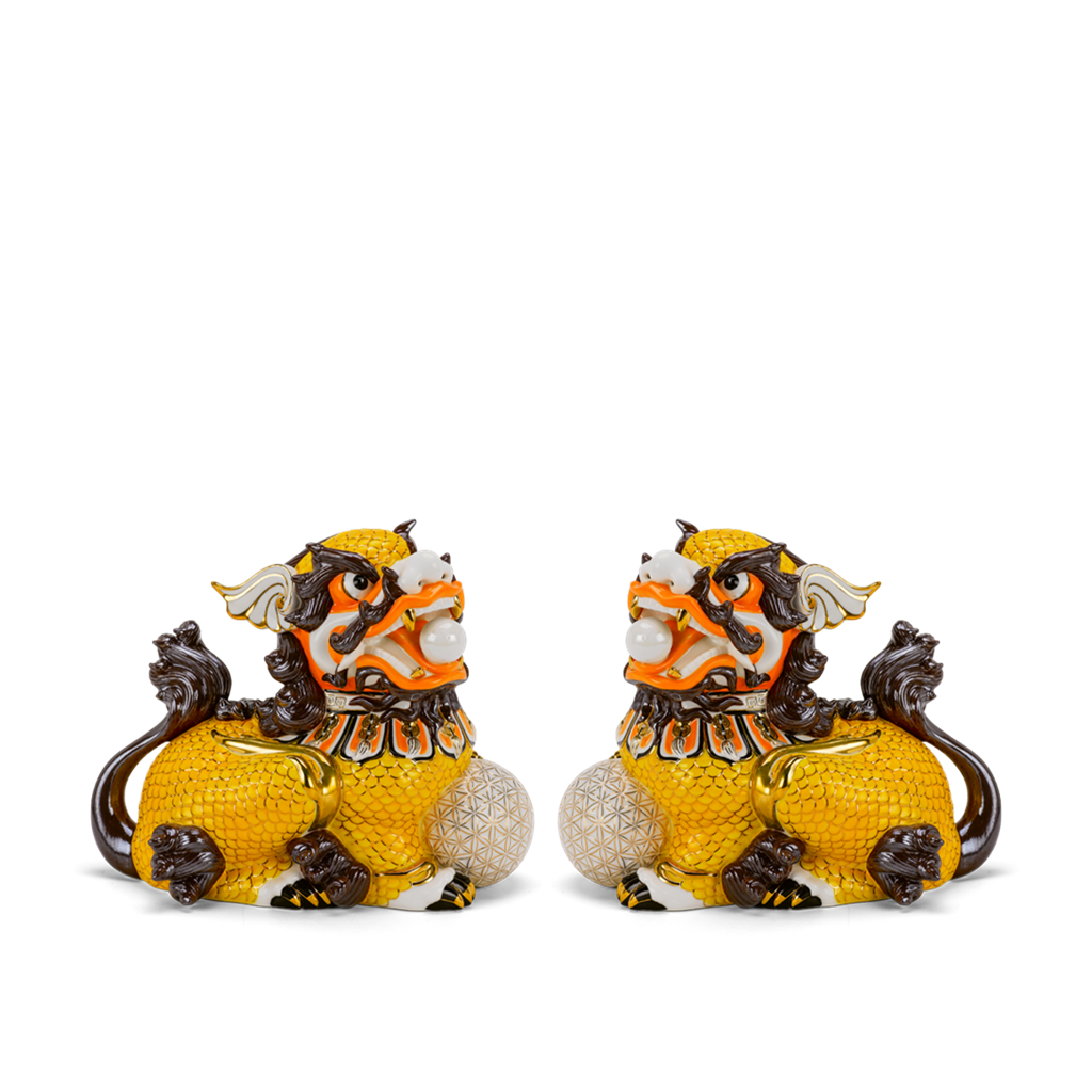 - Kỳ lân có đôi tai vểnh về phía sau, chân ôm quả cầu đầy uy phong. Miệng linh vật ngậm ngọc, há rộng, đôi mắt to tròn, sáng long lanh như thu vào tầm mắt mọi chuyển biến xung quanh, sẵn sàng chống lại cái ác. Những nét vẽ vàng ở chân, vành tai, khóe mắt, răng, vảy kết hợp với lối cách tân quyền quý bằng những đồng tiền vàng ở đai cổ kỳ lân đã nhân cách hóa một linh vật thiêng liêng mà gần gũi, uy dũng mà hiền hòa, cổ kính nhưng sang trọng.