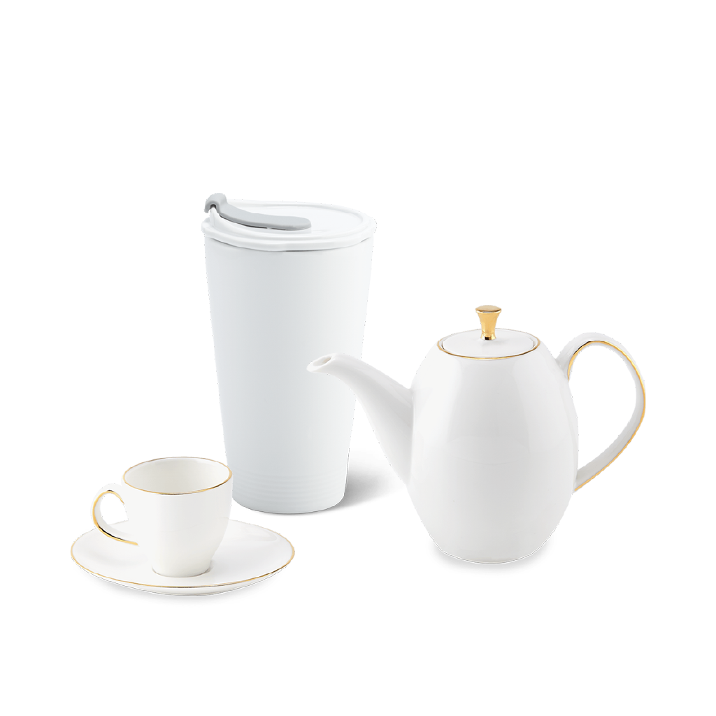 - Thiết kế hiện đại, tinh tế: Bộ trà sở hữu dáng cao thanh lịch, màu trắng ngà sang trọng với điểm nhấn viền chỉ vàng nổi bật, mang lại vẻ đẹp trang nhã và ấm áp.